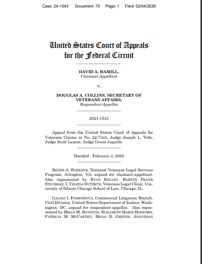 ARLINGTON, VA—Today, the United States Court of Appeals for the Federal Circuit held that the Department of Veterans Affairs (VA) can no longer deny a veteran’s claim without explicitly telling the veteran. In its opinion in Hamill v. Collins, the Federal Circuit decided that a 2017 law, which added more notice requirements for VA’s decisions, eliminated what is known as the implicit denial doctrine. Mr. Hamill is represented by the Veterans Legal Clinic at the University of Illinois Chicago School of Law (UIC Law) and the National Veterans Legal Services Program (NVLSP).
